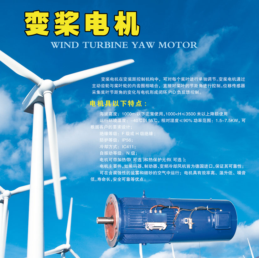 - 變槳電機在變槳距控制機構(gòu)中,可對每個槳葉進行單獨調(diào)節(jié)。變槳電機通過主動齒輪與槳葉輪的內(nèi)齒圈相嚙合,直接對槳葉的節(jié)距角進行控制。位移傳感器采集槳葉節(jié)距角的變化與電機形成閉環(huán)PID負反饋控制。特點:海拔高度:1000米以下正常使用,1000<H<3500米以上降額使用;運行環(huán)境溫度:-40到55,相對濕度<90%;功率范圍:1.5~7.5KW,可根據(jù)客戶的要求設計;絕緣等級:F級或H級絕緣;防護等級:IP56;冷卻方式:IC411;自振動等級:N級;電機可帶加熱帶(可選)和熱保護元件(可選);電機主要件,如編碼器、制動器、變頻冷卻風機皆為德國進口,保證其可靠性;可在含腐蝕性的鹽霧和細砂的空氣中運行;電機具有效率高、溫升低、噪音低、壽命長、案例可靠等優(yōu)點。變槳電機在變槳距控制機構(gòu)中,可對每個槳葉進行單獨調(diào)節(jié)。變槳電機通過主動齒輪與槳葉輪的內(nèi)齒圈相嚙合,直接對槳葉的節(jié)距角進行控制。位移傳感器采集槳葉節(jié)距角的變化與電機形成閉環(huán)PID負反饋控制。特點:海拔高度:1000米以下正常使用,1000<H<3500米以上降額使用;運行環(huán)境溫度:-40到55,相對濕度<90%;功率范圍:1.5~7.5KW,可根據(jù)客戶的要求設計;絕緣等級:F級或H級絕緣;防護等級:IP56;冷卻方式:IC411;自振動等級:N級;電機可帶加熱帶(可選)和熱保護元件(可選);電機主要件,如編碼器、制動器、變頻冷卻風機皆為德國進口,保證其可靠性;可在含腐蝕性的鹽霧和細砂的空氣中運行;電機具有效率高、溫升低、噪音低、壽命長、案例可靠等優(yōu)點。